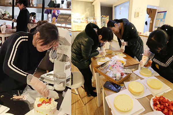 蛋糕烘焙對于公司女員工來(lái)說(shuō)是一項全新的體驗,大家興致勃勃,在專(zhuān)業(yè)烘焙師傅的指導下,按照腦中構思已久的造型進(jìn)行制作。大家相互幫助、相互贊美,打奶油、裱花、裝飾……每個(gè)人忙得不亦樂(lè )乎,經(jīng)過(guò)近兩個(gè)小時(shí)的時(shí)間,一個(gè)個(gè)創(chuàng )意十足的作品展現在大家的眼前。